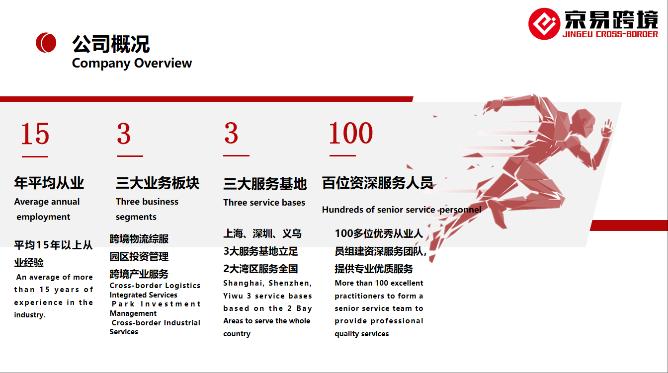京易跨境是一家专注于跨境产业服务的现代化企业,拥有三大核心优势:15年行业经验——团队平均从业经验超过15年;三大业务板块——跨境物流、园区投资管理、跨境产业服务;百位资深团队——100多位专业人才,覆盖上海、深圳、义乌三大服务基地,立足大湾区,辐射全国。我们不仅是行业的参与者,更是标准的制定者与未来的引领者。我们的目标是:用专业,让跨境企业走向国际大舞台!