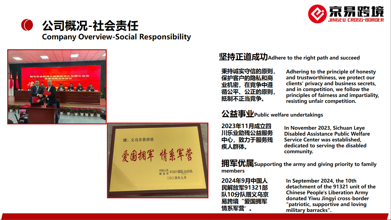京易跨境始终牢记企业的社会责任。在经营生产中,我们坚持正道成功,秉持诚实守信的原则,像保护自己的眼睛一样保护客户的隐私和商业机密,坚决抵制不正当竞争,维护公平公正的市场环境。在公益事业上,我们积极跟随国家步伐。2023 年 11 月,成立了四川乐业助残公益服务中心,实实在在地为残疾人群体解决困难。2024 年 9 月,中国人民解放军 91321 部队 10 分队赠予我们 “爱国拥军 情系军营” 的荣誉,这是对我们拥军优属工作的高度认可。